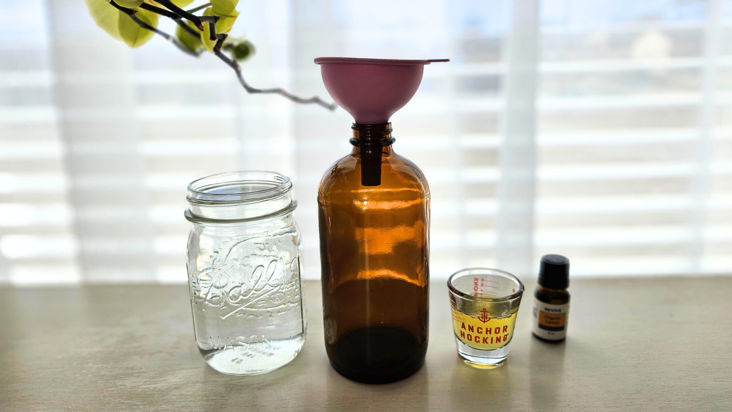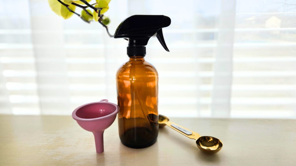 - Using a funnel, pour 2 cups of water into a 16oz glass spray bottle.