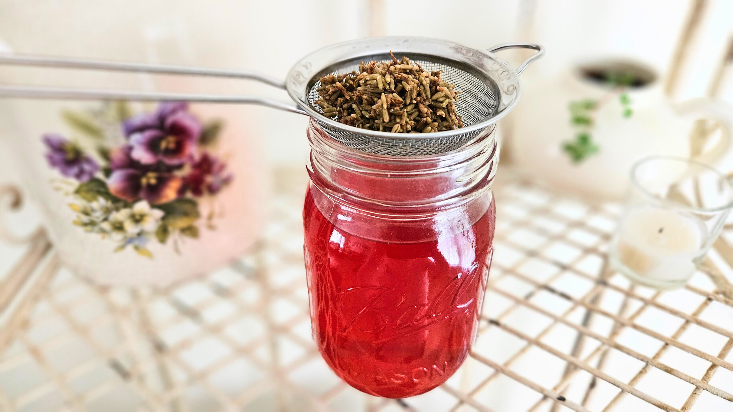 - Strain lavender flowers from vinegar using a fine mesh strainer.
