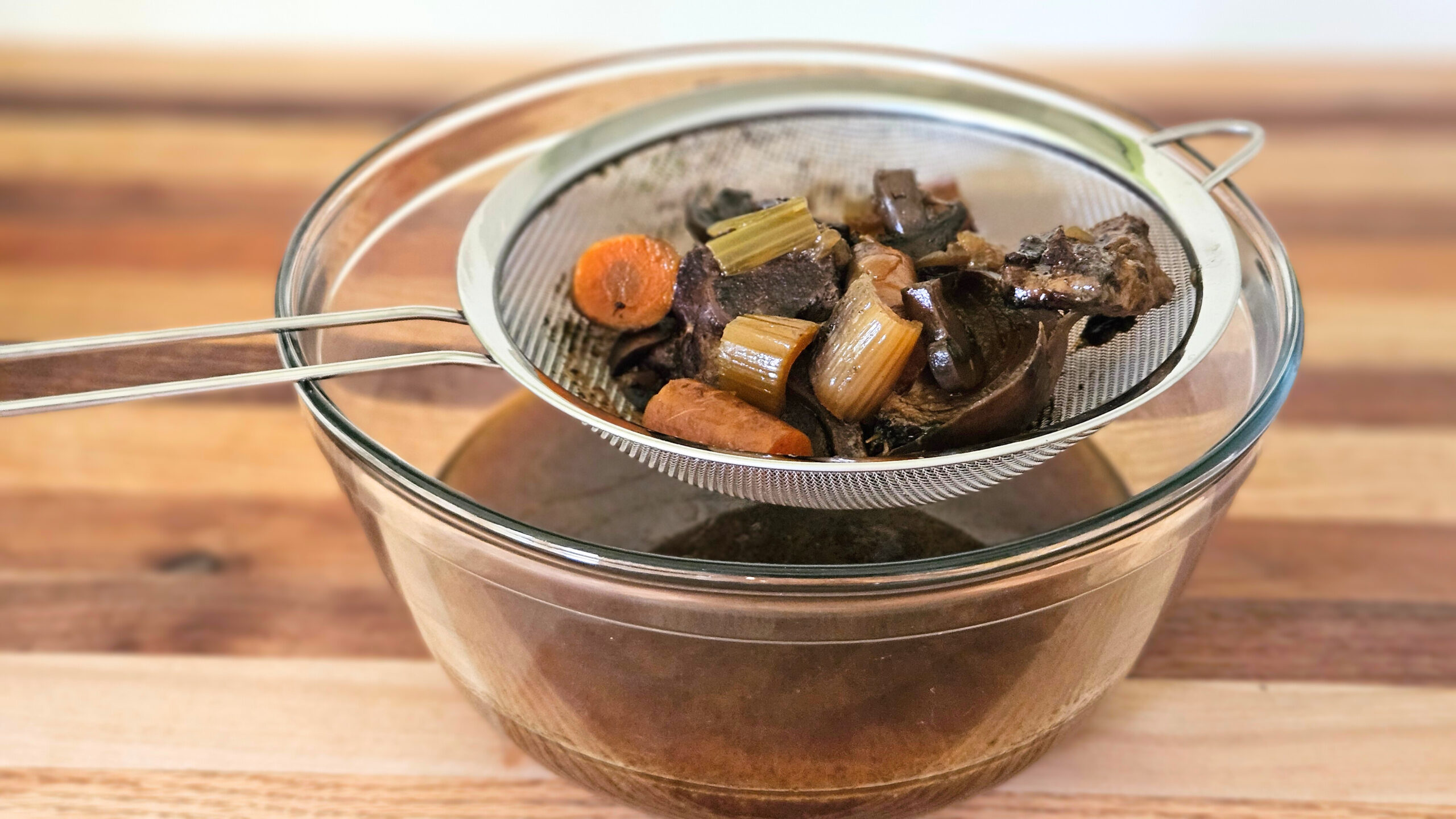 - After 48 hours, strain the broth through a fine mesh strainer. I like to place my fine mesh strainer above a large bowl and ladle the bone broth onto it.